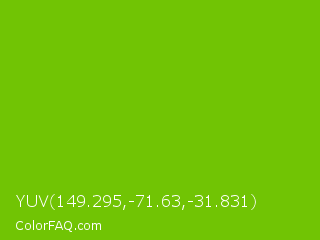 YUV 149.295,-71.63,-31.831 Color is a normal green color and the nearest color is Lima #76bd17. Hex code #71c404 and RGB value is rgb(113,196,4). In RGB color space, this color is composed of 44% red, 77% green, 2% blue, In CMYK color space, this color is composed of 42% cyan, 0% magenta, 98% yellow , 23% black , In HSL color space, this color has a hue angle of 86° , 96% saturation and 39% lightness.