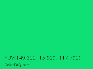 YUV 149.311,-15.929,-117.791 Color is a normal green color and the nearest color is Spring Green #00ff7f. Hex code #0fe075 and RGB value is rgb(15,224,117). In RGB color space, this color is composed of 6% red, 88% green, 46% blue, In CMYK color space, this color is composed of 93% cyan, 0% magenta, 48% yellow , 12% black , In HSL color space, this color has a hue angle of 149° , 87% saturation and 47% lightness.