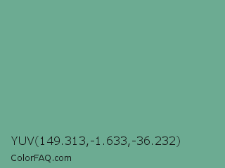 YUV 149.313,-1.633,-36.232 Color is a normal green color and the nearest color is Silver Tree #66b58f. Hex code #6cab92 and RGB value is rgb(108,171,146). In RGB color space, this color is composed of 42% red, 67% green, 57% blue, In CMYK color space, this color is composed of 37% cyan, 0% magenta, 15% yellow , 33% black , In HSL color space, this color has a hue angle of 156° , 27% saturation and 55% lightness.