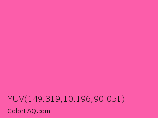 YUV 149.319,10.196,90.051 Color is a light rose color and the nearest color is Brilliant Rose #ff55a3. Hex code #fc5daa and RGB value is rgb(252,93,170). In RGB color space, this color is composed of 99% red, 36% green, 67% blue, In CMYK color space, this color is composed of 0% cyan, 63% magenta, 33% yellow , 1% black , In HSL color space, this color has a hue angle of 331° , 96% saturation and 68% lightness.