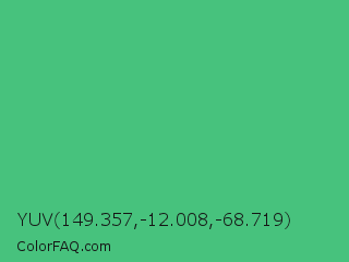 YUV 149.357,-12.008,-68.719 Color is a normal green color and the nearest color is Emerald #50c878. Hex code #47c27d and RGB value is rgb(71,194,125). In RGB color space, this color is composed of 28% red, 76% green, 49% blue, In CMYK color space, this color is composed of 63% cyan, 0% magenta, 36% yellow , 24% black , In HSL color space, this color has a hue angle of 146° , 50% saturation and 52% lightness.