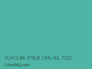 YUV 149.379,8.194,-61.722 Color is a normal cyan color and the nearest color is Verdigris #43b3ae. Hex code #4fb6a6 and RGB value is rgb(79,182,166). In RGB color space, this color is composed of 31% red, 71% green, 65% blue, In CMYK color space, this color is composed of 57% cyan, 0% magenta, 9% yellow , 29% black , In HSL color space, this color has a hue angle of 171° , 41% saturation and 51% lightness.