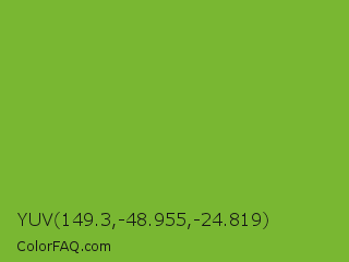 YUV 149.3,-48.955,-24.819 Color is a normal green color and the nearest color is Sushi #87ab39. Hex code #79b732 and RGB value is rgb(121,183,50). In RGB color space, this color is composed of 47% red, 72% green, 20% blue, In CMYK color space, this color is composed of 34% cyan, 0% magenta, 73% yellow , 28% black , In HSL color space, this color has a hue angle of 88° , 57% saturation and 46% lightness.