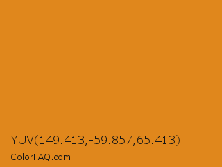 YUV 149.413,-59.857,65.413 Color is a normal orange color and the nearest color is Zest #e5841b. Hex code #e0871c and RGB value is rgb(224,135,28). In RGB color space, this color is composed of 88% red, 53% green, 11% blue, In CMYK color space, this color is composed of 0% cyan, 40% magenta, 88% yellow , 12% black , In HSL color space, this color has a hue angle of 33° , 78% saturation and 49% lightness.