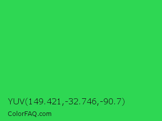 YUV 149.421,-32.746,-90.7 Color is a normal green color and the nearest color is UFO Green #3cd070. Hex code #2ed753 and RGB value is rgb(46,215,83). In RGB color space, this color is composed of 18% red, 84% green, 33% blue, In CMYK color space, this color is composed of 79% cyan, 0% magenta, 61% yellow , 16% black , In HSL color space, this color has a hue angle of 133° , 68% saturation and 51% lightness.