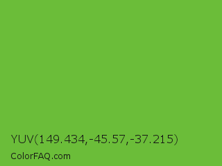 YUV 149.434,-45.57,-37.215 Color is a normal green color and the nearest color is Green RYB #66b032. Hex code #6bbd39 and RGB value is rgb(107,189,57). In RGB color space, this color is composed of 42% red, 74% green, 22% blue, In CMYK color space, this color is composed of 43% cyan, 0% magenta, 70% yellow , 26% black , In HSL color space, this color has a hue angle of 97° , 54% saturation and 48% lightness.