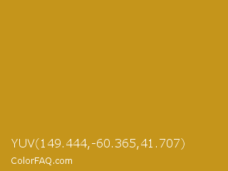 YUV 149.444,-60.365,41.707 Color is a normal orange color and the nearest color is Pizza #c99415. Hex code #c5951b and RGB value is rgb(197,149,27). In RGB color space, this color is composed of 77% red, 58% green, 11% blue, In CMYK color space, this color is composed of 0% cyan, 24% magenta, 86% yellow , 23% black , In HSL color space, this color has a hue angle of 43° , 76% saturation and 44% lightness.