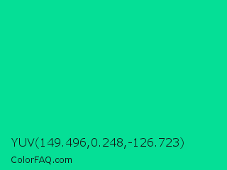 YUV 149.496,0.248,-126.723 Color is a normal green color and the nearest color is Caribbean Green #00cc99. Hex code #05df96 and RGB value is rgb(5,223,150). In RGB color space, this color is composed of 2% red, 87% green, 59% blue, In CMYK color space, this color is composed of 98% cyan, 0% magenta, 33% yellow , 13% black , In HSL color space, this color has a hue angle of 160° , 96% saturation and 45% lightness.
