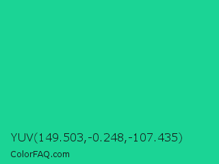 YUV 149.503,-0.248,-107.435 Color is a normal green color and the nearest color is Shamrock #33cc99. Hex code #1bd495 and RGB value is rgb(27,212,149). In RGB color space, this color is composed of 11% red, 83% green, 58% blue, In CMYK color space, this color is composed of 87% cyan, 0% magenta, 30% yellow , 17% black , In HSL color space, this color has a hue angle of 160° , 77% saturation and 47% lightness.