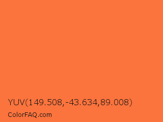 YUV 149.508,-43.634,89.008 Color is a light orange color and the nearest color is Orange Crayola #ff7538. Hex code #fb733d and RGB value is rgb(251,115,61). In RGB color space, this color is composed of 98% red, 45% green, 24% blue, In CMYK color space, this color is composed of 0% cyan, 54% magenta, 76% yellow , 2% black , In HSL color space, this color has a hue angle of 17° , 96% saturation and 61% lightness.
