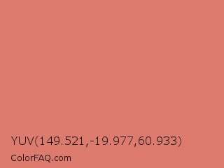 YUV 149.521,-19.977,60.933 Color is a light red color and the nearest color is Japonica #d87c63. Hex code #db7a6d and RGB value is rgb(219,122,109). In RGB color space, this color is composed of 86% red, 48% green, 43% blue, In CMYK color space, this color is composed of 0% cyan, 44% magenta, 50% yellow , 14% black , In HSL color space, this color has a hue angle of 7° , 60% saturation and 64% lightness.