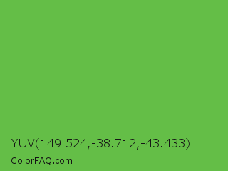 YUV 149.524,-38.712,-43.433 Color is a normal green color and the nearest color is Green RYB #66b032. Hex code #64be47 and RGB value is rgb(100,190,71). In RGB color space, this color is composed of 39% red, 75% green, 28% blue, In CMYK color space, this color is composed of 47% cyan, 0% magenta, 63% yellow , 25% black , In HSL color space, this color has a hue angle of 105° , 48% saturation and 51% lightness.