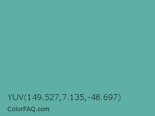 YUV 149.527,7.135,-48.697 Color is a normal cyan color and the nearest color is Tradewind #5fb3ac. Hex code #5eafa4 and RGB value is rgb(94,175,164). In RGB color space, this color is composed of 37% red, 69% green, 64% blue, In CMYK color space, this color is composed of 46% cyan, 0% magenta, 6% yellow , 31% black , In HSL color space, this color has a hue angle of 172° , 34% saturation and 53% lightness.