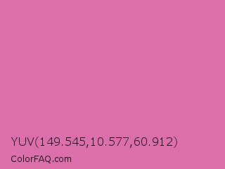 YUV 149.545,10.577,60.912 Color is a light magenta color and the nearest color is Thulian Pink #de6fa1. Hex code #db6eab and RGB value is rgb(219,110,171). In RGB color space, this color is composed of 86% red, 43% green, 67% blue, In CMYK color space, this color is composed of 0% cyan, 50% magenta, 22% yellow , 14% black , In HSL color space, this color has a hue angle of 326° , 60% saturation and 65% lightness.