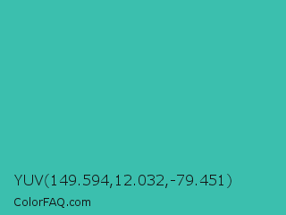 YUV 149.594,12.032,-79.451 Color is a normal cyan color and the nearest color is Puerto Rico #3fc1aa. Hex code #3bbfae and RGB value is rgb(59,191,174). In RGB color space, this color is composed of 23% red, 75% green, 68% blue, In CMYK color space, this color is composed of 69% cyan, 0% magenta, 9% yellow , 25% black , In HSL color space, this color has a hue angle of 172° , 53% saturation and 49% lightness.