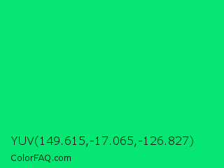 YUV 149.615,-17.065,-126.827 Color is a normal green color and the nearest color is Spring Green #00ff7f. Hex code #05e673 and RGB value is rgb(5,230,115). In RGB color space, this color is composed of 2% red, 90% green, 45% blue, In CMYK color space, this color is composed of 98% cyan, 0% magenta, 50% yellow , 10% black , In HSL color space, this color has a hue angle of 149° , 96% saturation and 46% lightness.