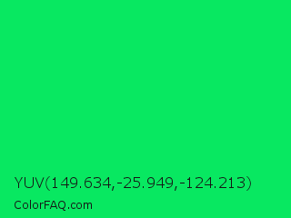 YUV 149.634,-25.949,-124.213 Color is a normal green color and the nearest color is Malachite #0bda51. Hex code #08e861 and RGB value is rgb(8,232,97). In RGB color space, this color is composed of 3% red, 91% green, 38% blue, In CMYK color space, this color is composed of 97% cyan, 0% magenta, 58% yellow , 9% black , In HSL color space, this color has a hue angle of 144° , 93% saturation and 47% lightness.