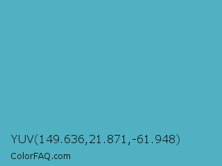 YUV 149.636,21.871,-61.948 Color is a normal cyan color and the nearest color is Fountain Blue #56b4be. Hex code #4fb1c2 and RGB value is rgb(79,177,194). In RGB color space, this color is composed of 31% red, 69% green, 76% blue, In CMYK color space, this color is composed of 59% cyan, 9% magenta, 0% yellow , 24% black , In HSL color space, this color has a hue angle of 189° , 49% saturation and 54% lightness.