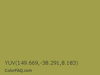 YUV 149.669,-38.291,8.183 Color is a normal yellow color and the nearest color is Brass #b5a642. Hex code #9fa048 and RGB value is rgb(159,160,72). In RGB color space, this color is composed of 62% red, 63% green, 28% blue, In CMYK color space, this color is composed of 1% cyan, 0% magenta, 55% yellow , 37% black , In HSL color space, this color has a hue angle of 61° , 38% saturation and 45% lightness.