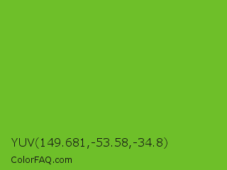 YUV 149.681,-53.58,-34.8 Color is a normal green color and the nearest color is Green RYB #66b032. Hex code #6ebf29 and RGB value is rgb(110,191,41). In RGB color space, this color is composed of 43% red, 75% green, 16% blue, In CMYK color space, this color is composed of 42% cyan, 0% magenta, 79% yellow , 25% black , In HSL color space, this color has a hue angle of 92° , 65% saturation and 45% lightness.