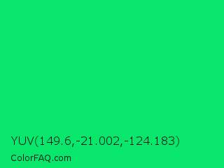 YUV 149.6,-21.002,-124.183 Color is a normal green color and the nearest color is Malachite #0bda51. Hex code #08e66b and RGB value is rgb(8,230,107). In RGB color space, this color is composed of 3% red, 90% green, 42% blue, In CMYK color space, this color is composed of 97% cyan, 0% magenta, 53% yellow , 10% black , In HSL color space, this color has a hue angle of 147° , 93% saturation and 47% lightness.