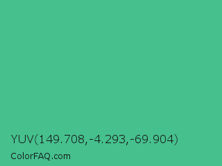 YUV 149.708,-4.293,-69.904 Color is a normal green color and the nearest color is Ocean Green #48bf91. Hex code #46c08d and RGB value is rgb(70,192,141). In RGB color space, this color is composed of 27% red, 75% green, 55% blue, In CMYK color space, this color is composed of 64% cyan, 0% magenta, 27% yellow , 25% black , In HSL color space, this color has a hue angle of 155° , 49% saturation and 51% lightness.