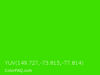 YUV 149.727,-73.815,-77.814 Color is a normal green color and the nearest color is Harlequin #3fff00. Hex code #3de000 and RGB value is rgb(61,224,-0). In RGB color space, this color is composed of 24% red, 88% green, 0% blue, In CMYK color space, this color is composed of 73% cyan, 0% magenta, 100% yellow , 12% black , In HSL color space, this color has a hue angle of 104° , 100% saturation and 44% lightness.