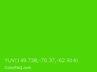 YUV 149.738,-70.37,-62.914 Color is a normal green color and the nearest color is Harlequin Green #46cb18. Hex code #4ed607 and RGB value is rgb(78,214,7). In RGB color space, this color is composed of 31% red, 84% green, 3% blue, In CMYK color space, this color is composed of 64% cyan, 0% magenta, 97% yellow , 16% black , In HSL color space, this color has a hue angle of 99° , 94% saturation and 43% lightness.