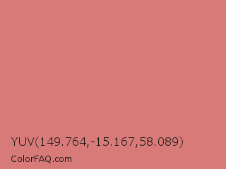 YUV 149.764,-15.167,58.089 Color is a light red color and the nearest color is New York Pink #d7837f. Hex code #d87a77 and RGB value is rgb(216,122,119). In RGB color space, this color is composed of 85% red, 48% green, 47% blue, In CMYK color space, this color is composed of 0% cyan, 44% magenta, 45% yellow , 15% black , In HSL color space, this color has a hue angle of 2° , 55% saturation and 66% lightness.