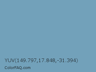 YUV 149.797,17.848,-31.394 Color is a normal blue color and the nearest color is Air Superiority Blue #72a0c1. Hex code #72a1ba and RGB value is rgb(114,161,186). In RGB color space, this color is composed of 45% red, 63% green, 73% blue, In CMYK color space, this color is composed of 39% cyan, 13% magenta, 0% yellow , 27% black , In HSL color space, this color has a hue angle of 201° , 34% saturation and 59% lightness.
