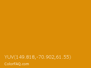 YUV 149.818,-70.902,61.55 Color is a normal orange color and the nearest color is Harvest Gold #da9100. Hex code #dc8e06 and RGB value is rgb(220,142,6). In RGB color space, this color is composed of 86% red, 56% green, 2% blue, In CMYK color space, this color is composed of 0% cyan, 35% magenta, 97% yellow , 14% black , In HSL color space, this color has a hue angle of 38° , 95% saturation and 44% lightness.