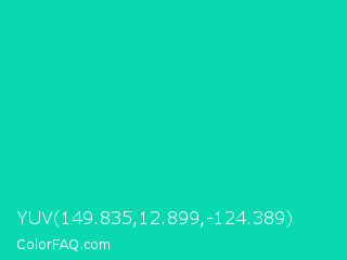 YUV 149.835,12.899,-124.389 Color is a normal cyan color and the nearest color is Amazonite #00c4b0. Hex code #08d9b0 and RGB value is rgb(8,217,176). In RGB color space, this color is composed of 3% red, 85% green, 69% blue, In CMYK color space, this color is composed of 96% cyan, 0% magenta, 19% yellow , 15% black , In HSL color space, this color has a hue angle of 168° , 93% saturation and 44% lightness.