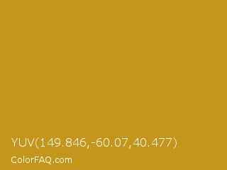 YUV 149.846,-60.07,40.477 Color is a normal orange color and the nearest color is Nugget #c59922. Hex code #c4961c and RGB value is rgb(196,150,28). In RGB color space, this color is composed of 77% red, 59% green, 11% blue, In CMYK color space, this color is composed of 0% cyan, 23% magenta, 86% yellow , 23% black , In HSL color space, this color has a hue angle of 44° , 75% saturation and 44% lightness.