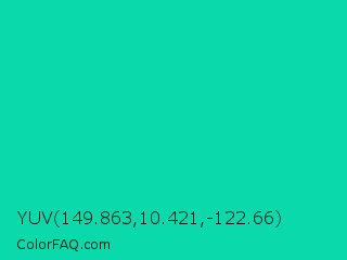 YUV 149.863,10.421,-122.66 Color is a normal cyan color and the nearest color is Amazonite #00c4b0. Hex code #0ad9ab and RGB value is rgb(10,217,171). In RGB color space, this color is composed of 4% red, 85% green, 67% blue, In CMYK color space, this color is composed of 95% cyan, 0% magenta, 21% yellow , 15% black , In HSL color space, this color has a hue angle of 167° , 91% saturation and 45% lightness.