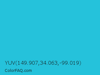 YUV 149.907,34.063,-99.019 Color is a normal cyan color and the nearest color is Scooter #2ebfd4. Hex code #25c2db and RGB value is rgb(37,194,219). In RGB color space, this color is composed of 15% red, 76% green, 86% blue, In CMYK color space, this color is composed of 83% cyan, 11% magenta, 0% yellow , 14% black , In HSL color space, this color has a hue angle of 188° , 72% saturation and 50% lightness.