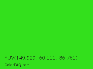 YUV 149.929,-60.111,-86.761 Color is a normal green color and the nearest color is Harlequin Green #46cb18. Hex code #33e01c and RGB value is rgb(51,224,28). In RGB color space, this color is composed of 20% red, 88% green, 11% blue, In CMYK color space, this color is composed of 77% cyan, 0% magenta, 88% yellow , 12% black , In HSL color space, this color has a hue angle of 113° , 78% saturation and 49% lightness.