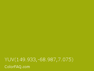 YUV 149.933,-68.987,7.075 Color is a normal yellow color and the nearest color is Pistachio Green #9dc209. Hex code #9ead0a and RGB value is rgb(158,173,10). In RGB color space, this color is composed of 62% red, 68% green, 4% blue, In CMYK color space, this color is composed of 9% cyan, 0% magenta, 94% yellow , 32% black , In HSL color space, this color has a hue angle of 66° , 89% saturation and 36% lightness.
