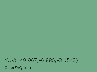 YUV 149.967,-6.886,-31.543 Color is a normal green color and the nearest color is Bay Leaf #7da98d. Hex code #72ab88 and RGB value is rgb(114,171,136). In RGB color space, this color is composed of 45% red, 67% green, 53% blue, In CMYK color space, this color is composed of 33% cyan, 0% magenta, 20% yellow , 33% black , In HSL color space, this color has a hue angle of 143° , 25% saturation and 56% lightness.