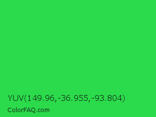 YUV 149.96,-36.955,-93.804 Color is a normal green color and the nearest color is Lime Green #32cd32. Hex code #2bdb4b and RGB value is rgb(43,219,75). In RGB color space, this color is composed of 17% red, 86% green, 29% blue, In CMYK color space, this color is composed of 80% cyan, 0% magenta, 66% yellow , 14% black , In HSL color space, this color has a hue angle of 131° , 71% saturation and 51% lightness.