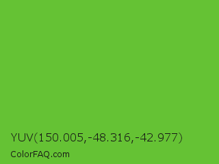 YUV 150.005,-48.316,-42.977 Color is a normal green color and the nearest color is Green RYB #66b032. Hex code #65c234 and RGB value is rgb(101,194,52). In RGB color space, this color is composed of 40% red, 76% green, 20% blue, In CMYK color space, this color is composed of 48% cyan, 0% magenta, 73% yellow , 24% black , In HSL color space, this color has a hue angle of 99° , 58% saturation and 48% lightness.