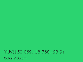 YUV 150.069,-18.768,-93.9 Color is a normal green color and the nearest color is UFO Green #3cd070. Hex code #2bd470 and RGB value is rgb(43,212,112). In RGB color space, this color is composed of 17% red, 83% green, 44% blue, In CMYK color space, this color is composed of 80% cyan, 0% magenta, 47% yellow , 17% black , In HSL color space, this color has a hue angle of 144° , 66% saturation and 50% lightness.