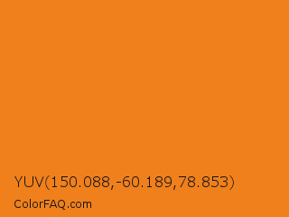 YUV 150.088,-60.189,78.853 Color is a normal orange color and the nearest color is Tango #ed7a1c. Hex code #f0801c and RGB value is rgb(240,128,28). In RGB color space, this color is composed of 94% red, 50% green, 11% blue, In CMYK color space, this color is composed of 0% cyan, 47% magenta, 88% yellow , 6% black , In HSL color space, this color has a hue angle of 28° , 88% saturation and 53% lightness.