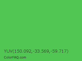 YUV 150.092,-33.569,-59.717 Color is a normal green color and the nearest color is Fern #63b76c. Hex code #52c652 and RGB value is rgb(82,198,82). In RGB color space, this color is composed of 32% red, 78% green, 32% blue, In CMYK color space, this color is composed of 59% cyan, 0% magenta, 59% yellow , 22% black , In HSL color space, this color has a hue angle of 120° , 50% saturation and 55% lightness.