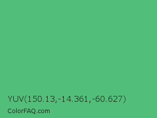 YUV 150.13,-14.361,-60.627 Color is a normal green color and the nearest color is Emerald #50c878. Hex code #51bf79 and RGB value is rgb(81,191,121). In RGB color space, this color is composed of 32% red, 75% green, 47% blue, In CMYK color space, this color is composed of 58% cyan, 0% magenta, 37% yellow , 25% black , In HSL color space, this color has a hue angle of 142° , 46% saturation and 53% lightness.