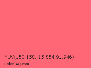 YUV 150.158,-15.854,91.946 Color is a light red color and the nearest color is Begonia #fa6e79. Hex code #ff6776 and RGB value is rgb(255,103,118). In RGB color space, this color is composed of 100% red, 40% green, 46% blue, In CMYK color space, this color is composed of 0% cyan, 60% magenta, 54% yellow , 0% black , In HSL color space, this color has a hue angle of 354° , 100% saturation and 70% lightness.