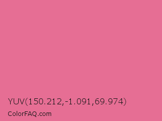 YUV 150.212,-1.091,69.974 Color is a light rose color and the nearest color is Bright Blush #e47698. Hex code #e66e94 and RGB value is rgb(230,110,148). In RGB color space, this color is composed of 90% red, 43% green, 58% blue, In CMYK color space, this color is composed of 0% cyan, 52% magenta, 36% yellow , 10% black , In HSL color space, this color has a hue angle of 341° , 71% saturation and 67% lightness.