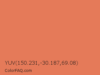 YUV 150.231,-30.187,69.08 Color is a light red color and the nearest color is Terracotta #e2725b. Hex code #e57a59 and RGB value is rgb(229,122,89). In RGB color space, this color is composed of 90% red, 48% green, 35% blue, In CMYK color space, this color is composed of 0% cyan, 47% magenta, 61% yellow , 10% black , In HSL color space, this color has a hue angle of 14° , 73% saturation and 62% lightness.