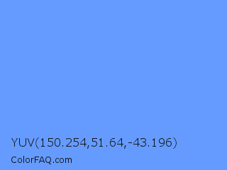 YUV 150.254,51.64,-43.196 Color is a light blue color and the nearest color is Cornflower Blue #6495ed. Hex code #659bff and RGB value is rgb(101,155,255). In RGB color space, this color is composed of 40% red, 61% green, 100% blue, In CMYK color space, this color is composed of 60% cyan, 39% magenta, 0% yellow , 0% black , In HSL color space, this color has a hue angle of 219° , 100% saturation and 70% lightness.