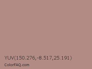 YUV 150.276,-8.517,25.191 Color is a light red color and the nearest color is Brandy Rose #bb8983. Hex code #b38b85 and RGB value is rgb(179,139,133). In RGB color space, this color is composed of 70% red, 55% green, 52% blue, In CMYK color space, this color is composed of 0% cyan, 22% magenta, 26% yellow , 30% black , In HSL color space, this color has a hue angle of 8° , 23% saturation and 61% lightness.