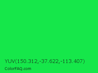YUV 150.312,-37.622,-113.407 Color is a normal green color and the nearest color is Malachite #0bda51. Hex code #15e74a and RGB value is rgb(21,231,74). In RGB color space, this color is composed of 8% red, 91% green, 29% blue, In CMYK color space, this color is composed of 91% cyan, 0% magenta, 68% yellow , 9% black , In HSL color space, this color has a hue angle of 135° , 83% saturation and 49% lightness.